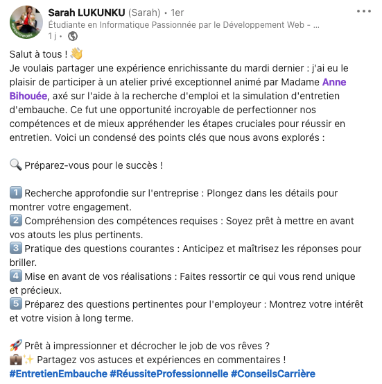 Un grand merci à Sarah pour son post me concernant. 🤗